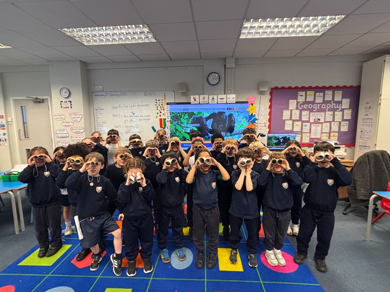 • This week, Pink 2 enjoyed a very practical lesson learning all about the famous pioneer Jane Goodall. Jane loved chimpanzees and devoted her life to studying them and working to keep their homes safe to prevent them from becoming extinct. The children in Pink 2 came up with some excellent questions they would ask Jane, as well as making their own set of Binoculars to use in the Jungle!
